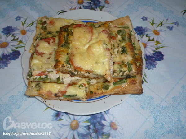 Пачка слоеного бездрожжевого теста (0,5кг) не раскатывала-просто разложила в форму, на тесто выложила зеленую фасоль (расстаявшую, но не вареную), дальше порвала на кусочки вареную курицу (2 грудки). Сыр 200 грамм смешала с зеленью (много: укроп, петрушка), все это на курицу. Порезала свежий помидор на тонкие кружочки и разложила. Хорошенько посыпала сыром и залила сливками 22% грамм 250 + яйцо (смешать и залить). В духовку. Печется он не долго, как верх и края зарумянились-готово!