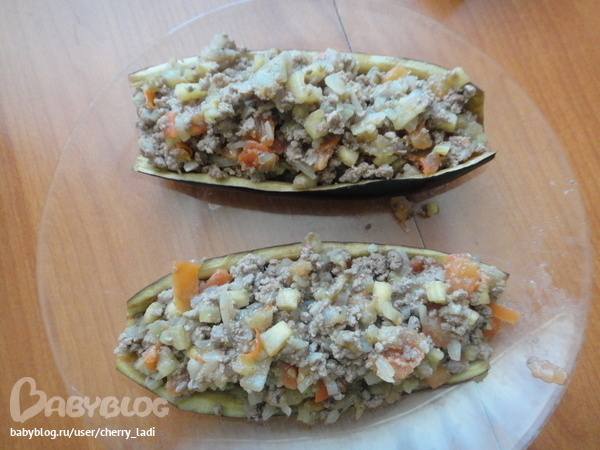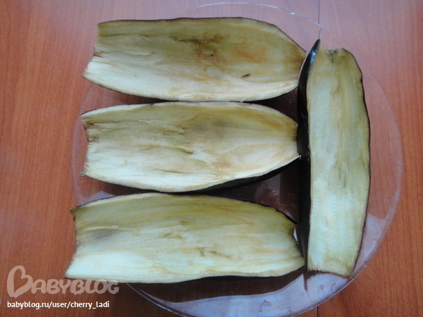 Готовим баклажаны. После мытья делим баклажан на 2 части и вытаскиваем внутренности, их нужно порезать кубиком(так же можно замочить в холодной воде, чтобы не горчили...но у меня на этонет времени, так незнаю сколько проспит сынок:) так что все готовим быстро:)))) как и помидорки