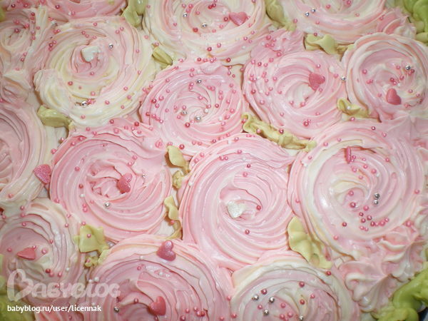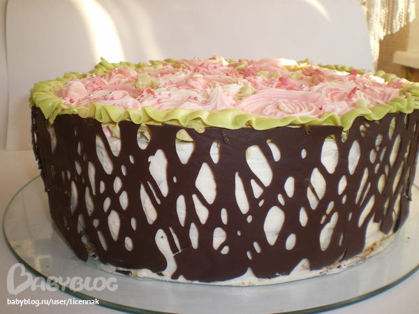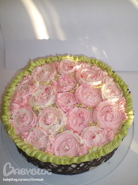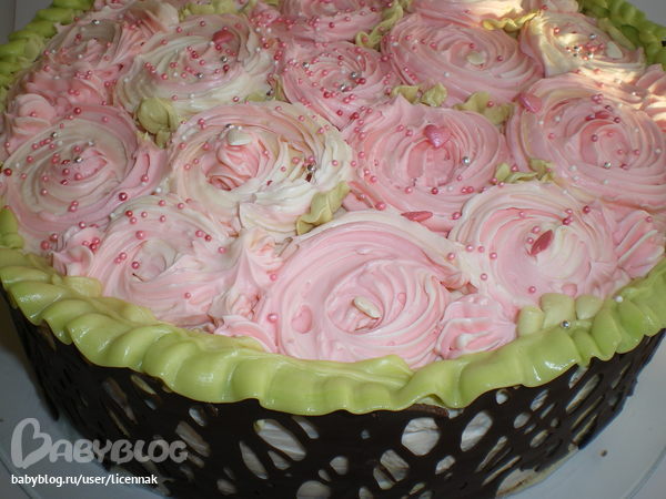 Привет) Спасибо огромное!!! Крем масляный. В мешочек одновремменно помещала крем белый и розовый, чтобы цвет розочек был неоднородный. Простора для фантазии мало было, так как всего 2 металлич. насадки у меня осталось для мешка, а пластиковые не люблю( Решетка из растопленного шоколада, сначала нарисовала на бумаге для выпечки, охладила и перенесла на торт. Все делала впервые, так что аккуратность подвела)))