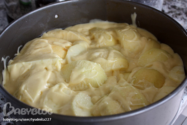 Выливаем тесто в смазанную маслом форму и режем туда яблоки:
