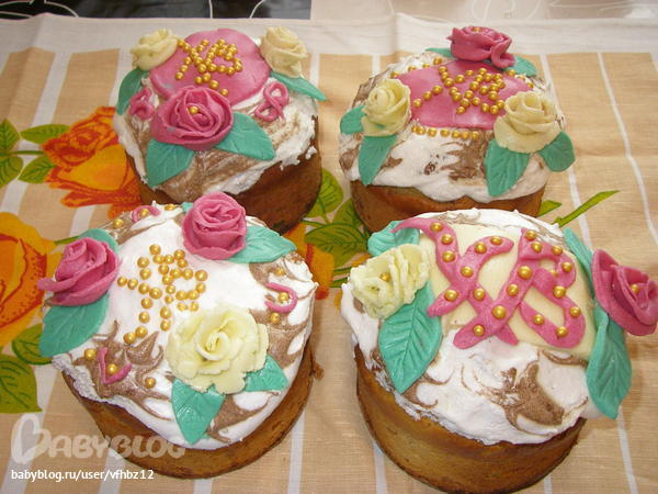 Спасибо. )))Рецептик брала у девочи здесь КУЛИЧ ЦАРСКИЙ. Там у нее вроде написано, самый вкусный рецепт кулича , а цветочки это мастика: сухое молоко и сгущенка, красила зеленкой и соком свеклы