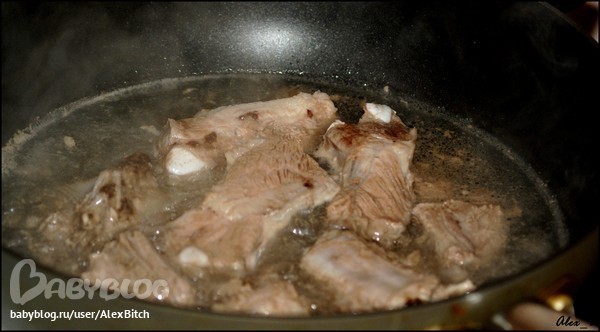 Я ребрышки сразу режу не крупно,чтоб удобно было кушать.Заливаю в глубокой сковороде ребрышки водой и варю на среднем огне.пока вода почти не выкипит,и не останется чуть боле половины стакана.При варке обавляю Маласянь (но можно без неё)