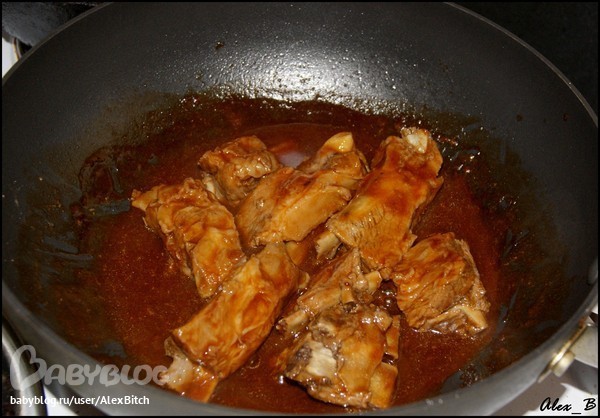 Когда сварились ребрышки,я их на блюдечко выкладывпаю и в остатки бульена добавляю специи сахар и кетчуп с уксусом,даю закепеть и туда ребрышки выкладываю,перемешиваю,и накрываю крыжкой на маленький огонь.