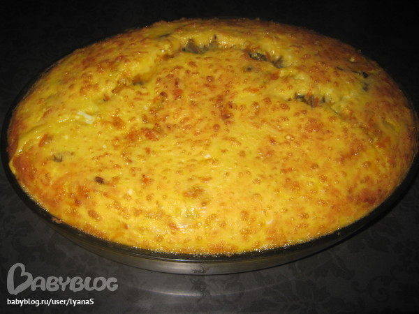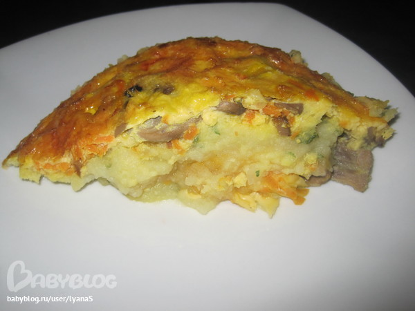 Приготовление: из картофеля приготовили пюре и добавили зелень, грибочки обжарили с луком, морковь с луком обжарили, сыр потерли на терке. Укладываем слоями: картофель,сыр,грибочки, морковь с луком, второй слой:картофель,морковь с луком, грибочки, сыр ивсе заливаем взбитым яйцом с солью и в духовку на 30 минут при температуре 200 градусов! Приятного аппетита!!!