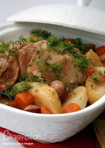 Жаркое из курицы, копченых колбасок и картофеля в пиве