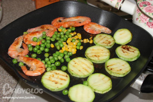На сковороде-гриль жарим теплую заправку (зажарить можно все что угодно - кусочек мяса, морепродукты...)