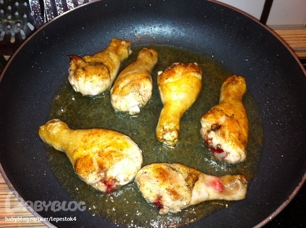 На другой сковороде обжариваем куринные ножки (не забываем посолить и поперчить).