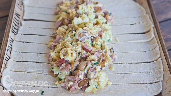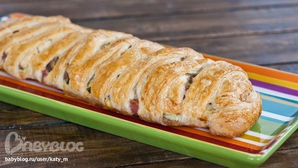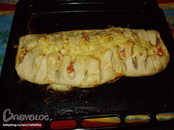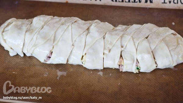 Порпробуй, оч вкусно и сытно. Только не разрезай сильно полосочки, а то начинка вывалится. И кастати, разрезай уже на противне, потому что я ступила, разрезала на доске, а когда стала выкладывать на протвень, половина рулета рассыпалась)
