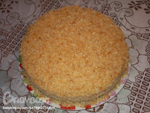 рецепт:тесто готовое слоенное(у меня бездрожжевое)расскатать,положить сверху плоскую тарелку и обрезать вдоль неё ножом,так у вас будут ровные одинаковые коржи,выпекаем по очереди,обрезки так же выпечь и перемолоть в блендере.