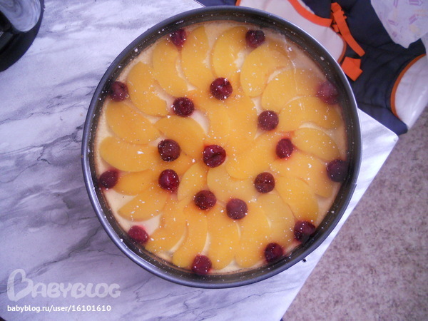 Я конечно не знаю,по какому рецепту автор делала,но может что то вроде этого,только с фруктами импровизация.Вот посмотрите http://www.say7.info/cook/recipe/817-Tort-klubnikoy.html может пригодится.