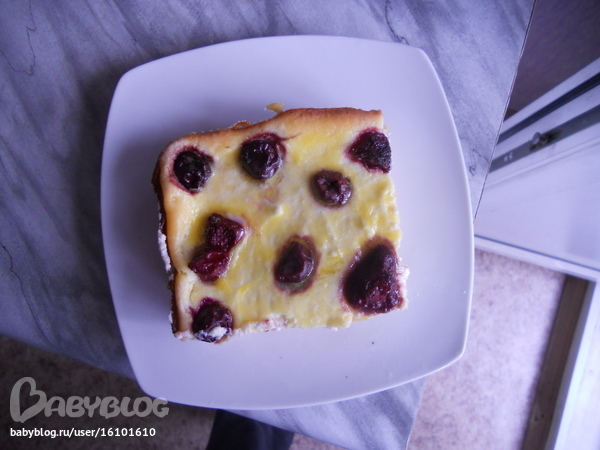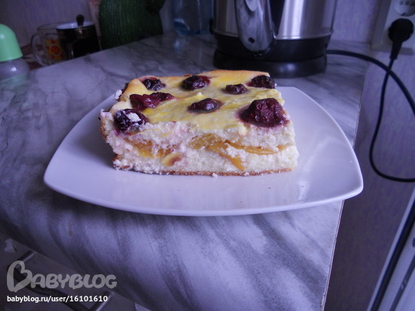 В самой запеканке у меня проложен ряд консервированных персиков, с верху вишня и клубника.