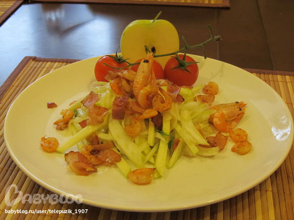 СалатыФенхель и яблоко нарезать соломкой, заправить оливковым маслом и соком лимона, выложить горкой на тарелку. Бекон нарезать на полоски и обжарить на сковороде вместе с креветками, выложить на салат.