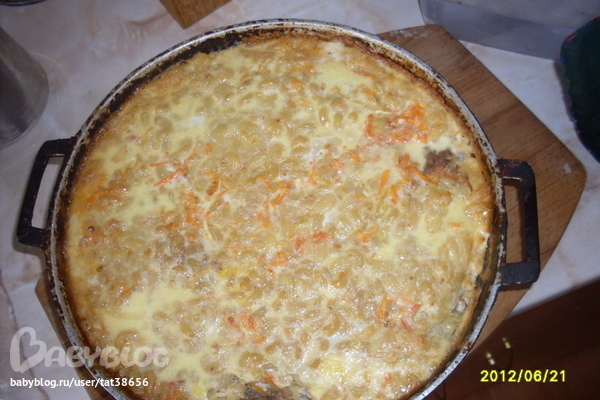 Сковородку смазали маслом, на нее слой сухих макарон прямо из пачки, слой овощей ( все ,что дома нашла - натерла на терке и все ( морковь, лук, перец, помидоры), слой сырого фарша ( у меня было немного говяжьего ), слой овощей, слой сухих макарон. Взяла 3 яйца, разболтала со сливками ( можно с молоком, можно с водой, сметаной, майонезом, кетчупом, вообщем с чем угодно) и заливаем этим запеканку до верха. И пусть готовится , а мы отдыхаем. У меня макароны полностью не покрылись - долила воды. И потом через час еще воды долила. Стояло в духовке это пару часов ( можно было и меньше ). А , солила и перчила я именно заливку. Вкусно и легко. Сверху за 15 минут до конца надо посыпать сыром, но у меня его не было. И без сыра вкусно.