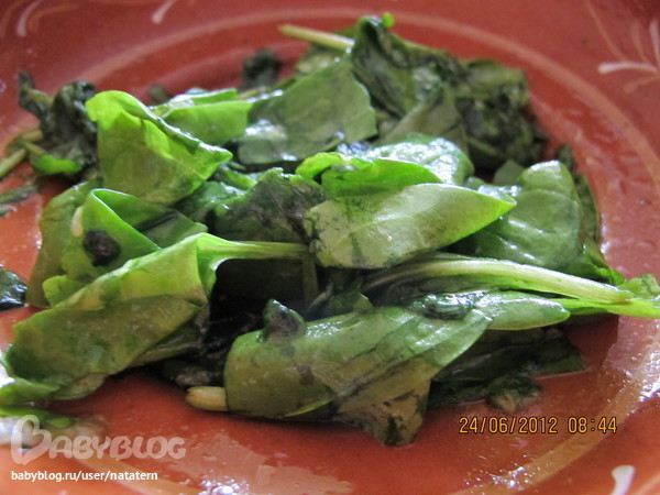 листья шпината смешать с оливковым маслом, солбю и выдавленным чесноком. Всё! Приятного аппетита!