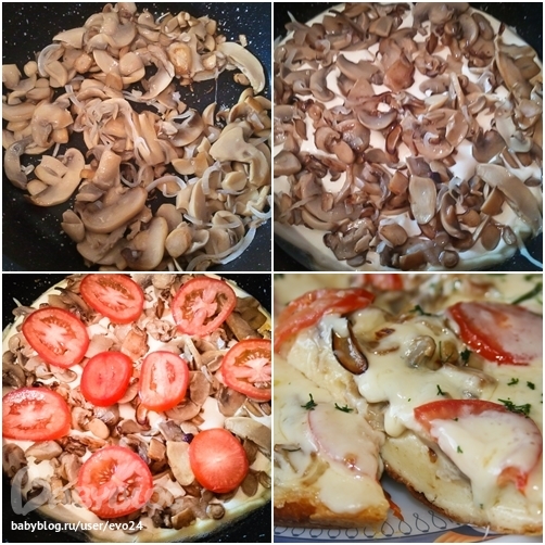 Приготовление: Замешиваем все ингридиенты до устранения комочков. Выливаем тесто на предварительно смазанную растительным маслом сковороду (у меня сковорода с толстым дном и антипригарным покрытием). Сверху выкладываем обжаренные шампиньоны с луком, затем помидоры и посыпаем сыром.