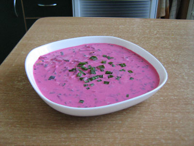 Я очень люблю готовить холодный борщ(литовский). 1 литр кефира(3.2%)+200гр сметаны+ 3 вареных яйца(мелко порезать)+2-3 средних отварных свеклы, натертых на терке+2 средних огурца(можно натереть на терке, а можно и мелко нарезать)+зеленый лук и укроп+соль и черный перец по вкусу. Кушать его надо холодным(после приготовления подержать 1-2 часа в холодильнике). В Литве его подают с вареной картошкой(вместо хлеба). Дочка моя просто обожает этот супчик!