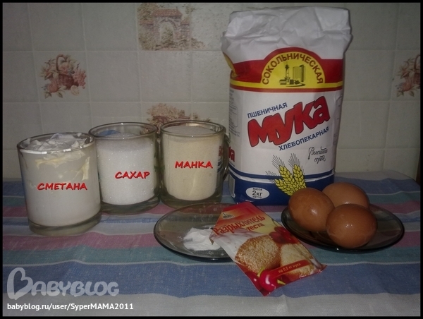 1) Берём стакан сметаны и стакан манной крупы, смешиваем вместе в миске и отставляем минут на 20 постоять.