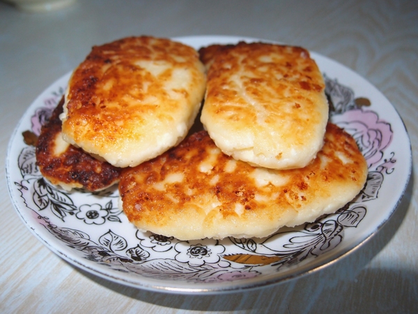 Смешать все ингредиенты и хорошо вымесить. Слепить сырники, слегка обвалять в муке и обжаривать на растительном или сливочном масле. Подавать с фруктовым сиропом или вареньем.