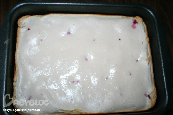 Вылить тесто, равномерно распределить, а потом ложкой выложить творожный крем!