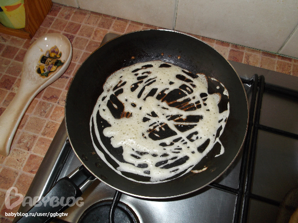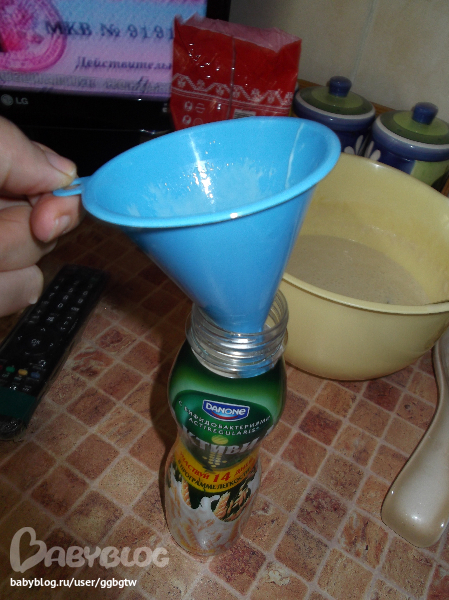 Далее берем воронку и лъем туда уже готовую блинную смесь.