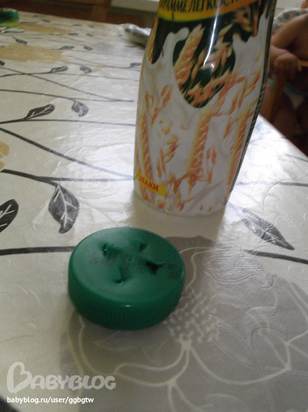 Пока тесто поднимается, для блинов (я люблю дрожжевые), берем бутылочку и прокалываем (ножом) дырочки на крышечке бутылки. В моем случае это была бутылочка из под актимель.