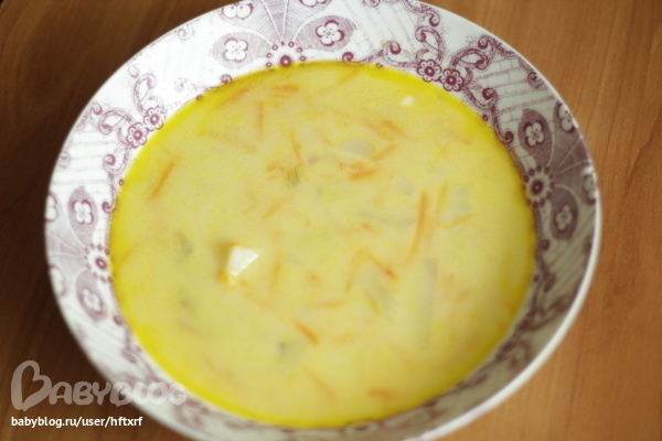 В общем, кипятим воду в кастрюльке, кидаем туда картошку, пока варится картофель, пассируем морковь и лук (я люблю, когда моркови ну очень много). Когда картошка сварилась, кладем в кастрюлю ребрышки и нарезанный карбонат, доводим докипения, солим-перчим, перекладываем в кастрюлю пассировку из моркови и лука, и даем супчику покипеть минутки 3.Затем нужно выключить плиту, и кладем в суп сливочный сыр. В большинстве рецептов написано брать сыр "Дружба", но мне большенравится хохланд в ванночках.
