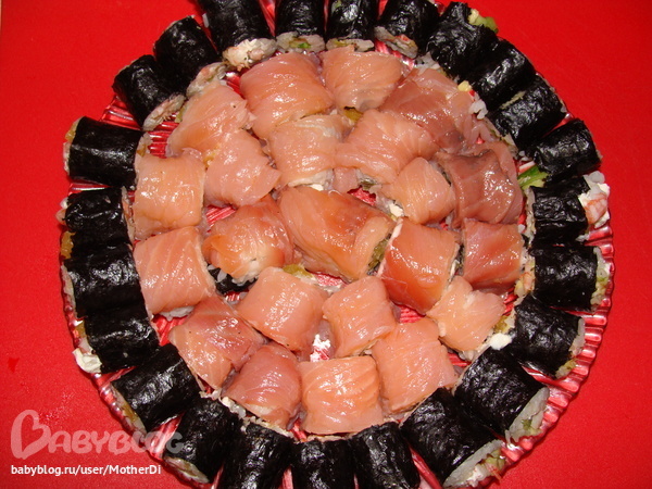 Первый блин был комом, не правильно сварился рис. Точнее я его сварила, потом вступила в дело подружка, для нее это был второй раз и сделала все правильно. В итоге получилось вкусно и много