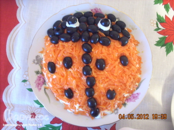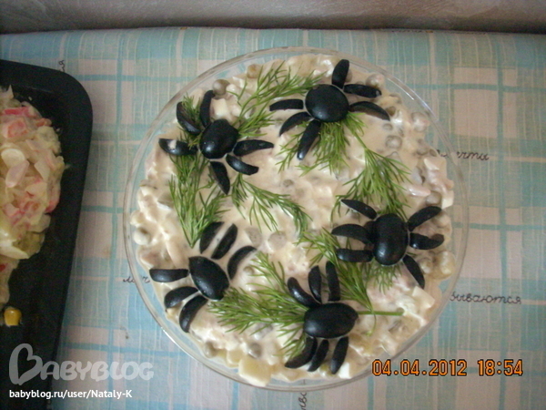 Частенько беру за основу уже полюбившиеся салатики и украшаю их соотвественно поводу. Были еще такие:
