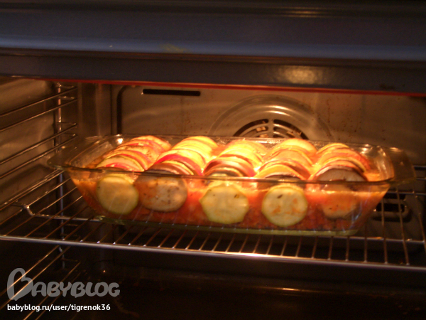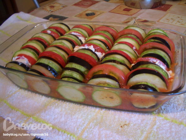 Кстати, красиво выглядит только в сыром виде)) Наверное, остальное фотошоп?(в интернете))) Я между овощами ложила брынзу, мне понравилось (видела в контакте такую картинку) Жидкость, это соус - помидоры прокрученые в блендере с прованскими травами(продается готовая приправа, так и называется)