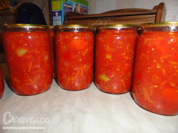 Помидоры пропустить через мясорубку (либо на тёрке), прокипятить 5 - 7 минут, добавить сахар, соль, растительное масло и уксус, дать закипеть и добавить перец, морковь (её тоже можно либо на тёрке, либо небольшими брусочками) и лук порубленный по вкусу (ломтики, брусочки, квадратики).