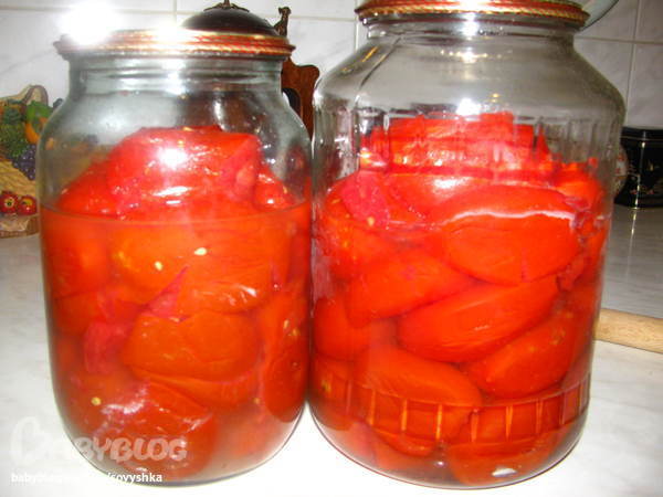 вырезает плодоножку, выжимает руками помидор (получается весь сок уходит), кладет в банку мякоть. Выкладывает так до верху, сильно-сильно прижимая помидоры. Потом ставит в кастрюлю с водой, после того как вода закипит держит 12 минут, огонь выключает. Как вода остынет, вынимает бынки. ВСЕ. Ни соли, ничего.