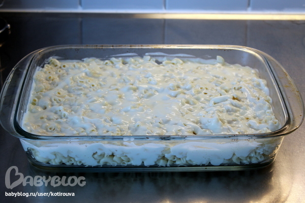 Отварила макарошки и вылодила их в стеклянную форму.