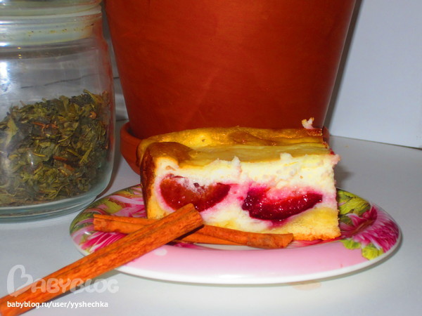 200г муки, 1 яйцо, 60 г сахара, 120г размягченного масла,1/2 ч.л. разрыхлителя смешать быстро и в холодильник на час. Затем достать, выложить в форму /не забыть про высокие бортики!/, выложить сливы /700г/ без косточек, разрезом вверх, присыпать густо сахарной пудрой и корицей, залить кремом: 2 желтка соединить с 250г творога, 100г сахара, 70-100 г крахмала, 200г сметаны, щепотью корицы, затем ввести осторожно взбитые ранее 2 белка и залить данной смесью сливы. Выпекать минут 50-60. Очень вкусно!