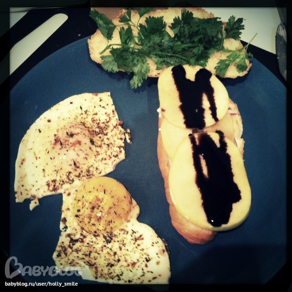 Круассанчик,яблоко,сладкий лук,сыр(козий ,можно любой другой или без него)кинза,2 яйца,бальзамический соус и специи