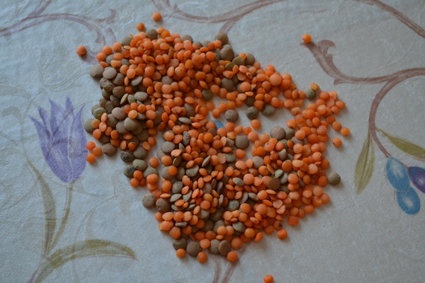 чечевица-у меня была 2-х видов-красная и серая (можно использовать и нут,фасоль различную,но тогда придется вымачивать несколько часов)