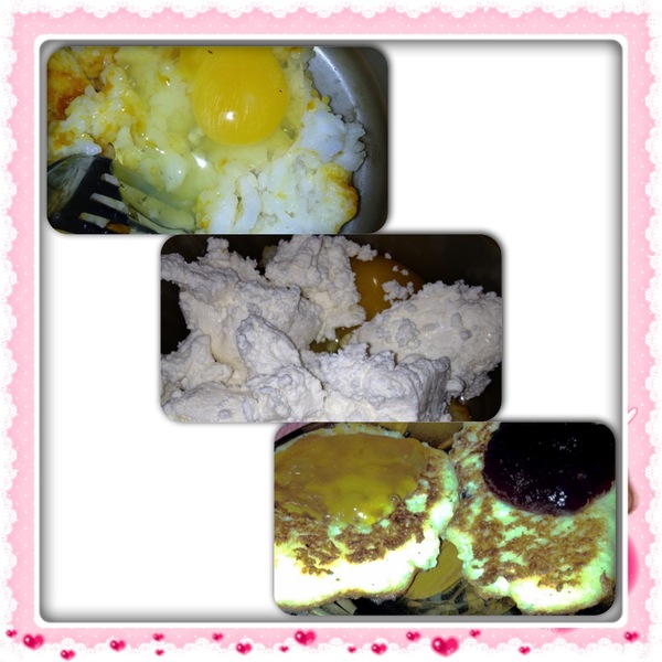 добавила яйца,далее творог,немного сметаны(кефира или йогурта),сахара,пару ложек муки, и.... манку!!!пару ложек.Даю этой смеси настояться(чтобы манка немного разбухла) и выпекаю на масле.Мы кушали с абрикосовым и черничным джемом(на фото).а дети со сгущенкой!