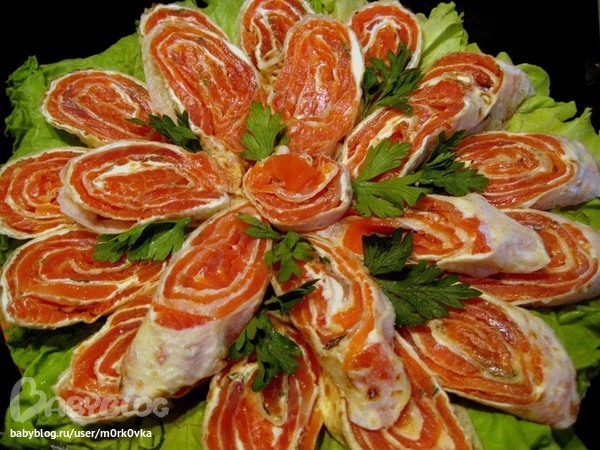 Лаваш намазывается плавленным сыром,типа виола. Далее раскладывается зелень( по своему вкусу) и семга( можно любую другую слабосоленую рыбку.) Закатать в рулетик, Обматать пленкой и на ночь в холодильник. Потом просто нарезать на ломтики. За закуску просто супер!