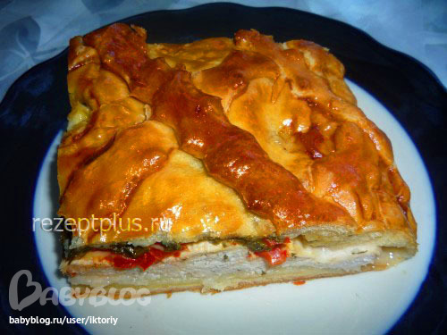 Состав: упаковка слоеного дрожжевого теста, перец болгарский-1-2шт., сыр-100г, филе курицы-800г, чеснок, зелень, соль, перец.