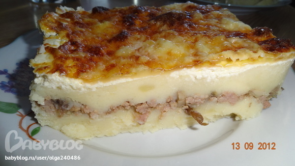 Кладем масло сливочное, яйца и можно молочка подогретого добавить.Хорошо взбиваем пюре, я это делала миксером.Далее делаем начинку:обжариваем лук немного и добавляем фарш, солим и жарим пока не испариться жидкость.Обжариваем грибы ( у меня были белые).Фарш и грибы смешиваем воедино.Берем противень (противень промазать сливочным маслом) и накладываем слоями: