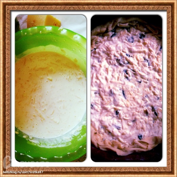 Яйца слегка взбить вилкой, добавить сливки и сыр, хорошо перемешать, залить равномерно полученной смесью начинку.