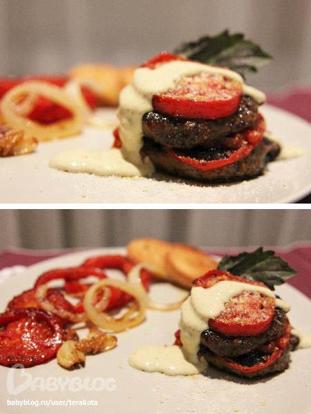 Проще некуда) Обжарила овощи на оливковом масле, у меня это болг. перец, помидоры, лук,чеснок. Под грилем чесночные гренки. Потом обжарила мясо, с веточками базилика и розмарина. Выложила слоями мясо-помидоры, сверху соус и пармезан!