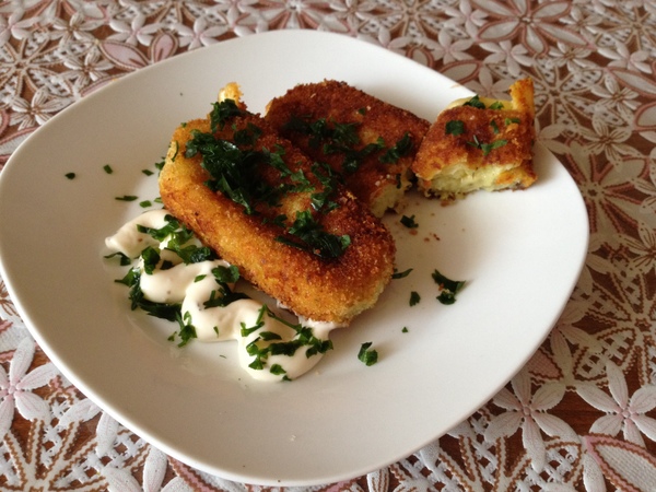 Ингредиенты:5 средних варёных картофелин 2 яйца 100 г панировочных сухарей 100 г твёрдого сыра 2-3 ст. л муки растительное масло (для жарки) чёрный молотый перец, соль - по вкусу кориандр, (по желанию)куркума *(необязательно)кайенский перец, фенхель (по желанию) Можно добавить свои любимые специи по вкусу!Приготовление:1. Картофель отварить в мундире, очистить, натереть на тёрке или пропустить через мясорубку.2. Добавить яйца, специи, соль, тщательно перемешать.3. Добавить к полученной массе просеянную муку, перемешать. Основа для картофельных палочек готова!4. Сыр нарезать "брусочками".5. Влажными руками сформировать картофельные палочки, в середину положить сыр, обвалять в панировочных сухарях и обжарить с !4-х сторон на растительном масле до образования золотистой корочки.6. Подавать картофельные палочки можно горячими или тёплыми с вашим любимым соусом.