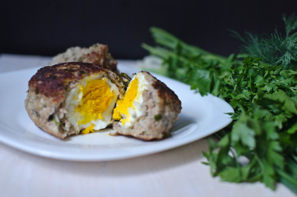 Слепить из фарша 2 лепешки, в середину каждой положить по вареному яйцу. Защипать края лепешек так, чтобы яйца оказались закрыты со всех сторон.