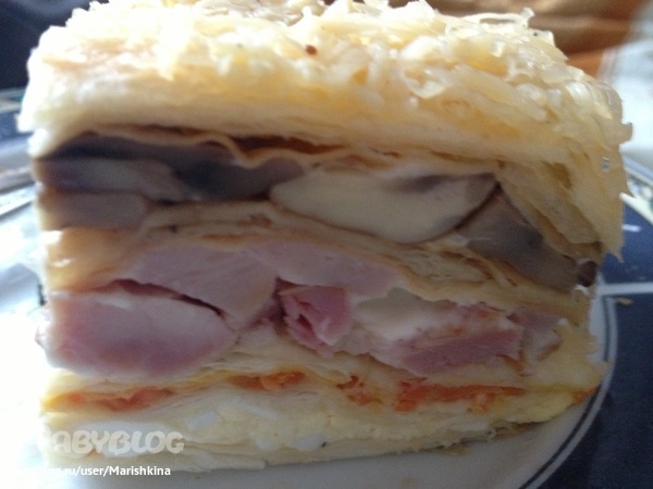 Коржи брала готовые для торта напалеон, промазывала соусом (сметана+майонез+чеснок+приправы)