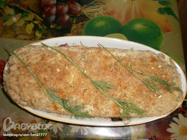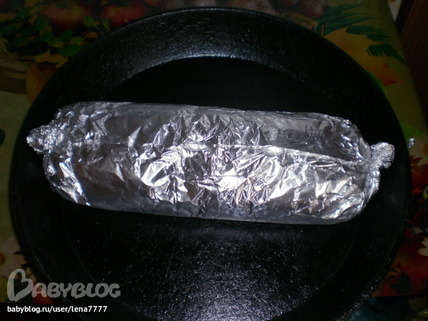 рецепт: 500гр куриного мяса, 2 картошки, 1 лук, 1з чеснока, 2 яйца, манка 2 ложки. Все помолоть и перемешать и выложить на фольгу первый слой, на верх 4 яйца в линечку, второй слой выкладываите на яйца в виде колбаски и заворачиваите в фольгу и в духовку на 40-50 минут.