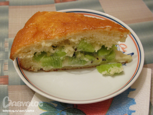 Как-то на днях захотелось этого пирога, старшая дочь его просто обожает. И я решила попробовать сделать его с киви, они мне, почему-то, клубнику напоминают:) Получилось так же вкусно!!! Может на вид и не очень красиво (верх я срезаю полностью, не делая надрезы по периметру), но, поверьте мне, ОЧЕНЬ вкусно!!!