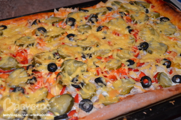 Ложим начинку: мясо или колбасу, порезанный лук, перец, соленые огурцы, можно оливки.