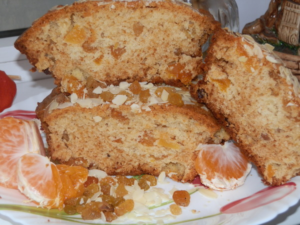 В миске растереть 150 гр.размягченного сливочного масла со 100 гр.сахара и 2-мя стол.ложками жидкого меда,вбить 2 яйца.Массу взбить миксером.В 250 гр муки добавить пакетик(5 гр) разрыхлителя и помешивая порциями маслянную смесь замесить тесто.В тесто добавить смеь рубленных орехов(по вкусу),курагу,изюм.Выложить тесто в форму,сверху посыпать орехами и поставить в духовку на 1 час при темп.160 град.