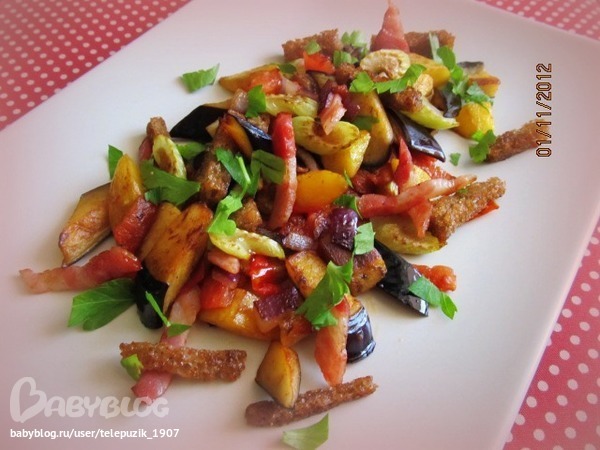 В моём салате подружились баклажан, тыква, красный сладкий лук, помидорчик и черешковый сельдерей. Все овощи нарезать одинаковыми кубиками и быстро обжарить на хорошо разогретой сковороде. Через пару минут добавить к овощам порезанные полосками копчёную грудинку и чёрный хлеб , чтобы хлеб стал хрустящим. Всё. Можно пробовать. Этот салатик отличный перекус или закусочка)))