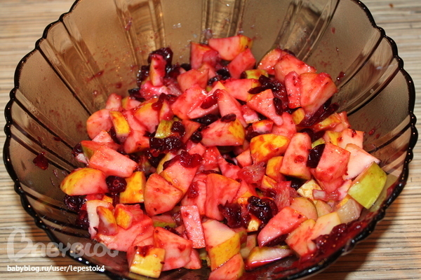 Режим кубиками или треугольниками яблоко, пару кружков лимона. Клюкву я растолкла толкушкой в кашицу, все это смешиваем.